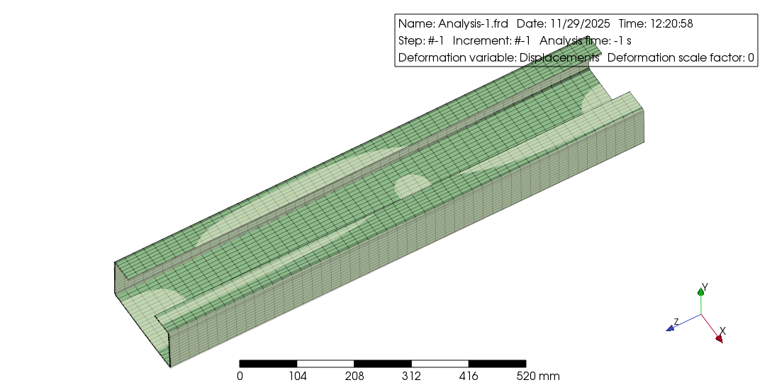 Generates final shape of imperfection is a tedious work and it could be useful when PrePoMax can do automatically. Below an example of imperfection models taken from eigenfrequency analysis, each mode needs to be saved and rerunning for total of sixth teen cases to generate final shape of imperfection. User defined by maximum imperfection (units of length) for each mode is more clearly than scale factors, usually a portion to width or height of sections e.g 1/200. Zero value can be meaning of previous deformed geometry being used to skip without analysis to run.