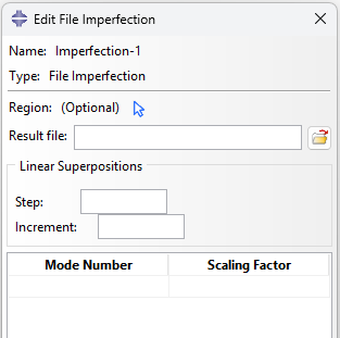 Based on eigenmodes - superposition of weighted mode shapes, you specify the file containing the results from eigenfrequency extraction or eigenvalue buckling analysis, then enter mode numbers and their corresponding scaling factors in the data lines. Optionally, you can choose the target nset.