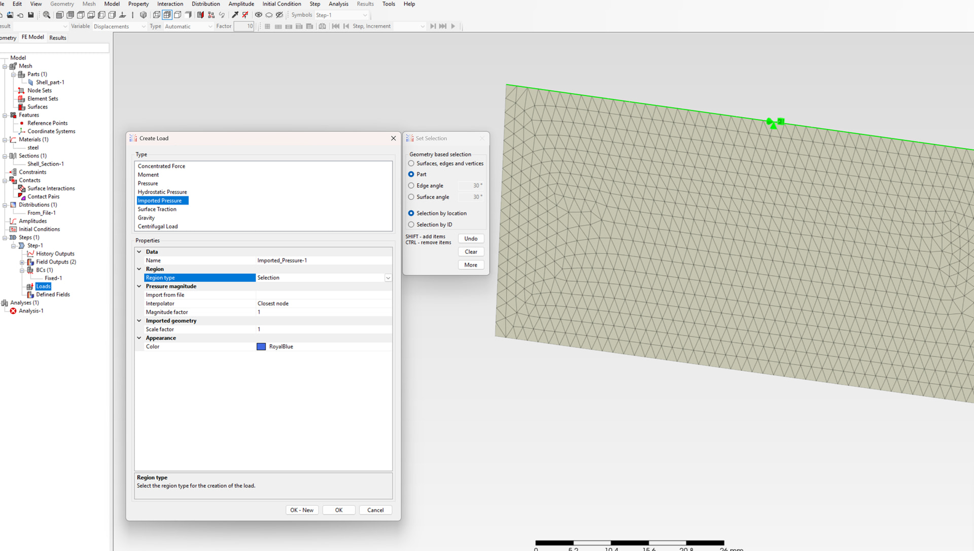 The Imported Pressure load that you show here is meant for use with OpenFOAM CFD analysis results. You should try regular Pressure or Surface Traction load with associated Distribution from file.
